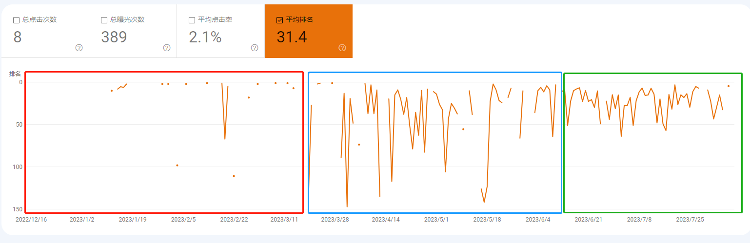 关键词排名,红框部分优化前3个月,处于若有若无的阶段;到了3月16日后数据有了明显的排名,但依然较后。但在5月30日后,排名逐渐提高,已经占领前6页搜索结果。坚持就是胜利!