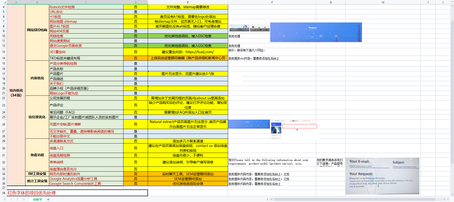 ① 收到客户的请求,马上安排优化师进行32项网站检测,并给出内容修改建议